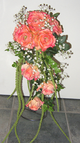Hier ein Traum in champagner! Offene und halboffene Rosen in champagner mit zartem Organzaband und Blüten/Perlen-Girlande geschmückt. |